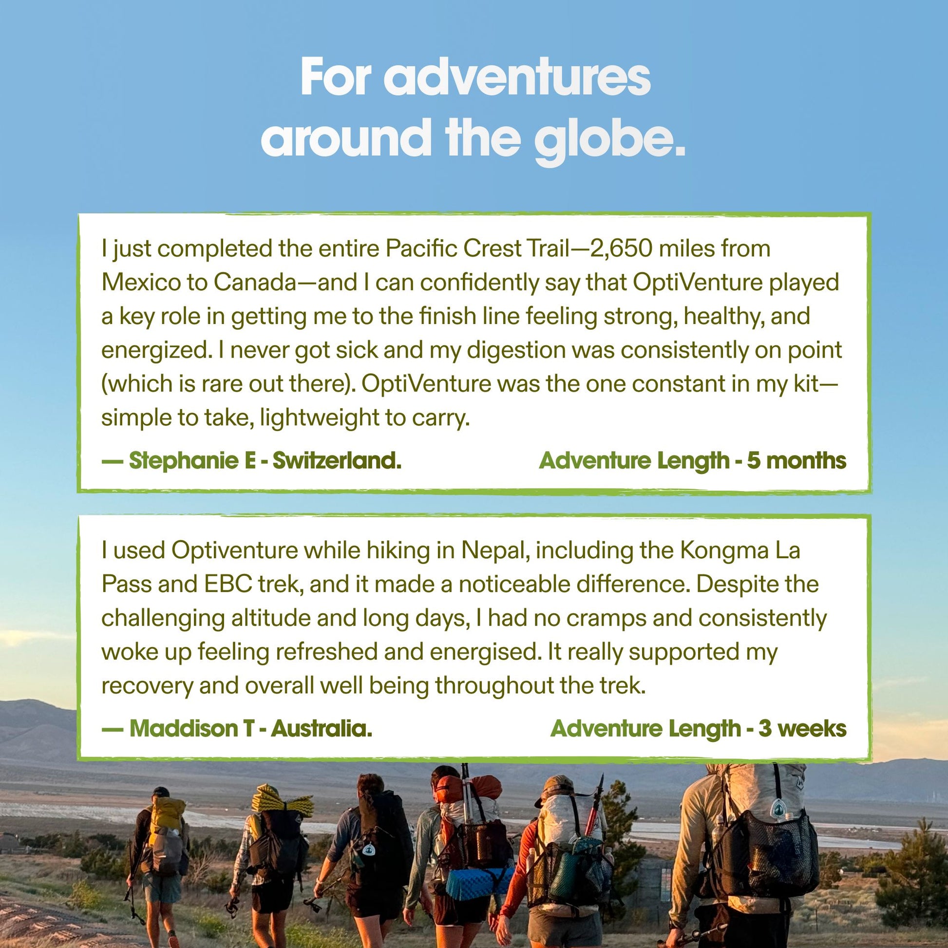 Last year, I thru hiked the PCT. I took no supplements on this thru hike. On my recent adventure hiking ~400 in South America (Patagonia & Andes Mts), I brought Optiventure along. There was a notable difference in my recovery time, consistency in energy levels, gut reactivity to new foods, and sleep quality. I finished these 6 weeks of trekking feeling strong. With the limited diversity in foods and micronutrients available on trail (unless you've taken months to dehydrate all your own food), supplementation simply feels necessary. Glad to see something like this on the market for adventurers!